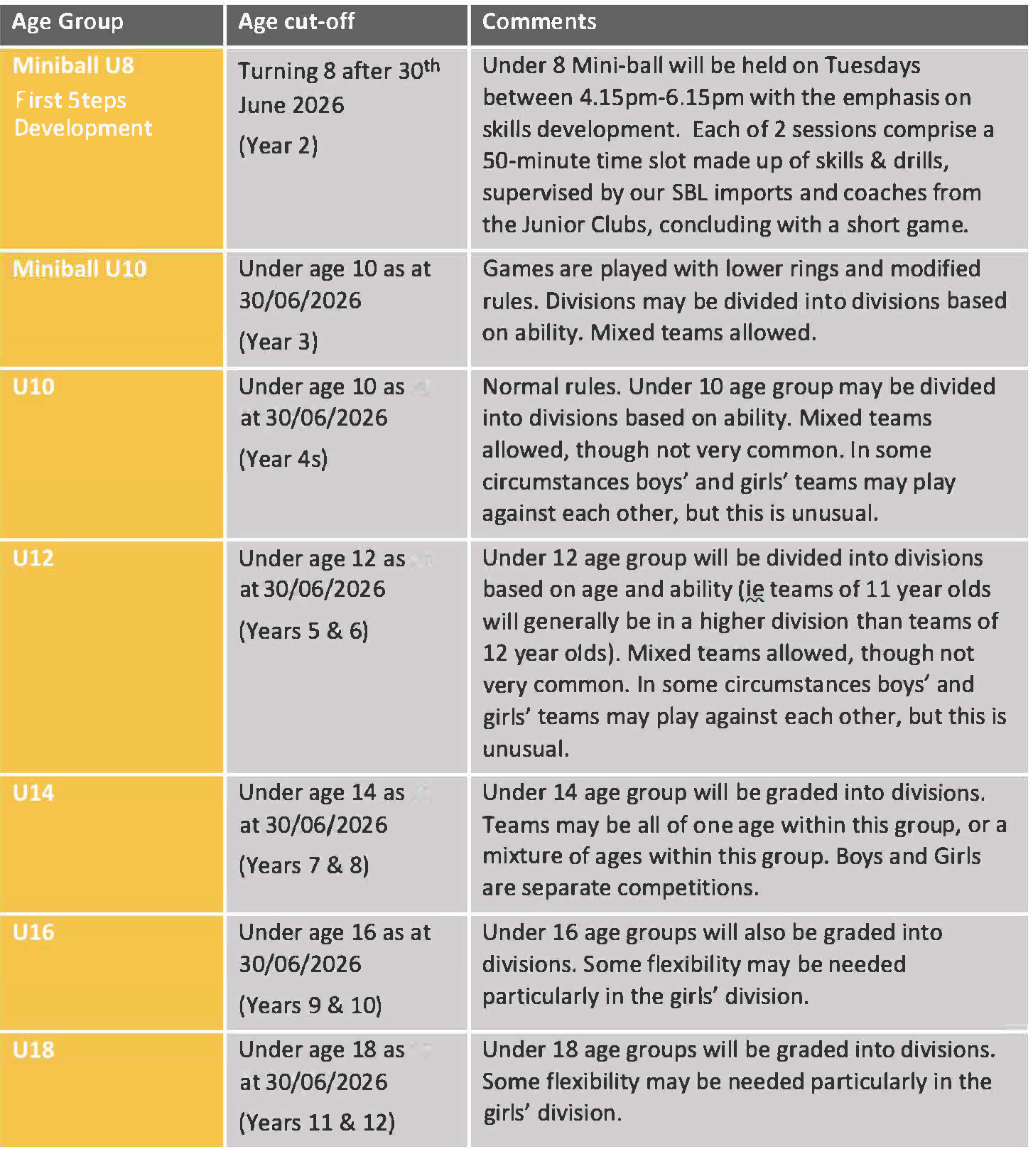 Miniball will be divided into divisions based on age and ability. Girls and boys can play in the same team and boys and girls teams may play each other. Miniball shall consist of Year 3s (8 yr olds). Games are played with lower rings and modified rules.